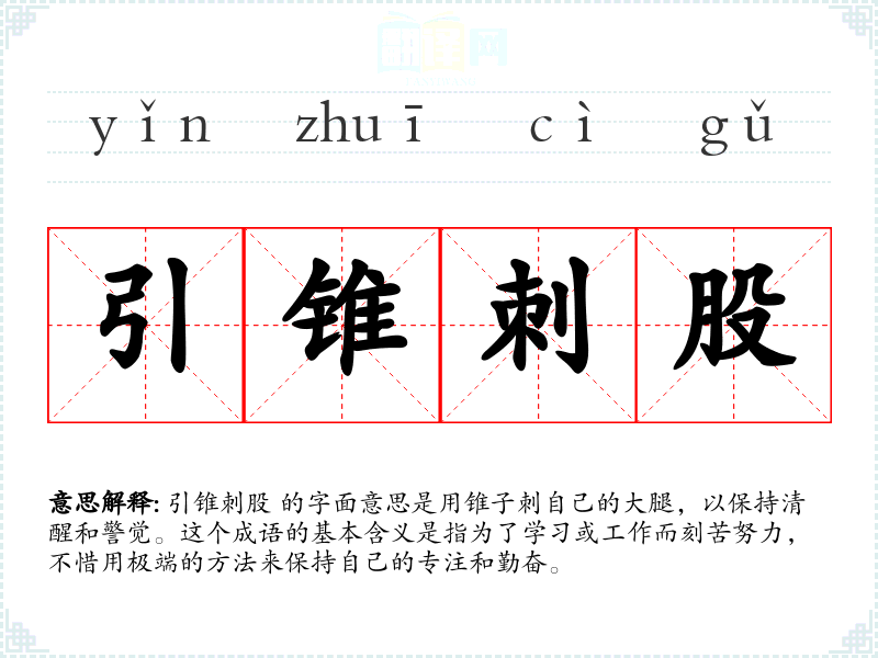 引锥刺股 的字面意思是用锥子刺自己的大腿,以保持清醒和警觉。这个成语的基本含义是指为了学*或工作而刻苦努力,不惜用极端的方法来保持自己的专注和勤奋。