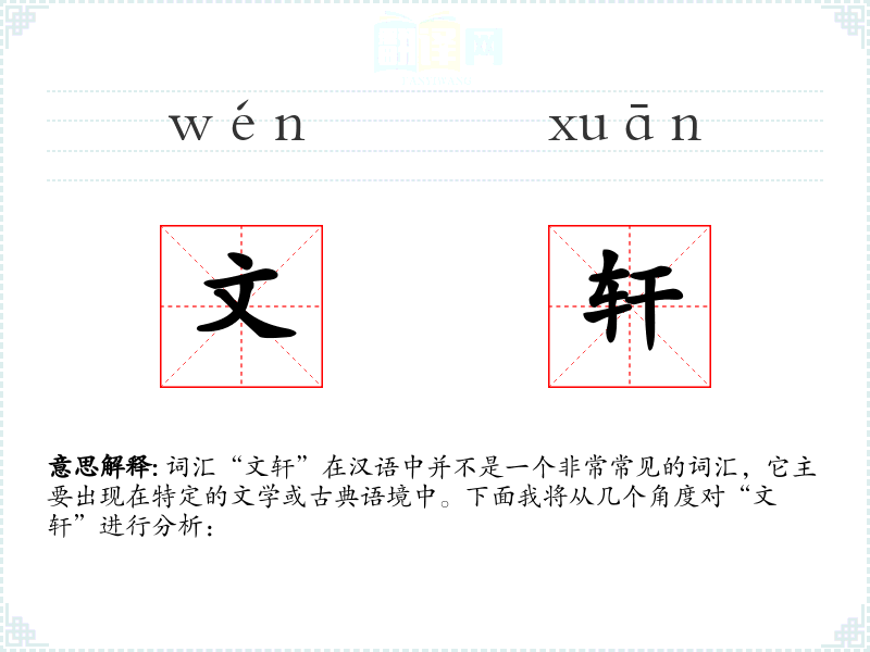 “文轩”字面意思是指装饰精美、文雅的书房或藏书室。其中,“文”通常指文化、文学或文雅,“轩”则指高大的房屋或楼阁。因此,“文轩”可以理解为一个充满文化气息的高雅空间。