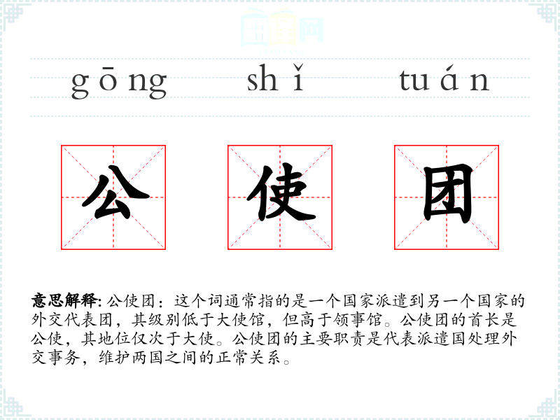 公使团:这个词通常指的是一个国家派遣到另一个国家的外交代表团,其级别低于大使馆,但高于领事馆。公使团的首长是公使,其地位仅次于大使。公使团的主要职责是代表派遣国处理外交事务,维护两国之间的正常关系。