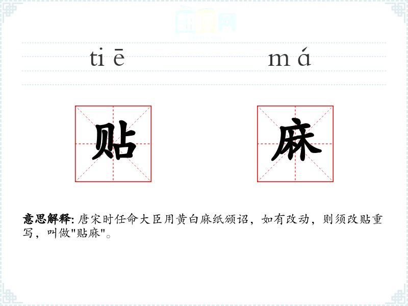 唐宋时任命大臣用黄白麻纸颁诏,如有改动,则须改贴重写,叫做"贴麻"。