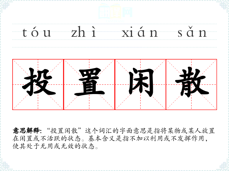 “投置闲散”这个词汇的字面意思是指将某物或某人放置在闲置或不活跃的状态。基本含义是指不加以利用或不发挥作用,使其处于无用或无效的状态。
