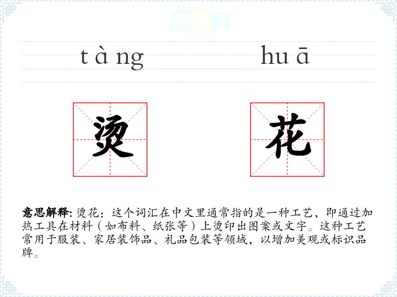 烫花:这个词汇在中文里通常指的是一种工艺,即通过加热工具在材料(如布料、纸张等)上烫印出图案或文字。这种工艺常用于服装、家居装饰品、礼品包装等领域,以增加美观或标识品牌。