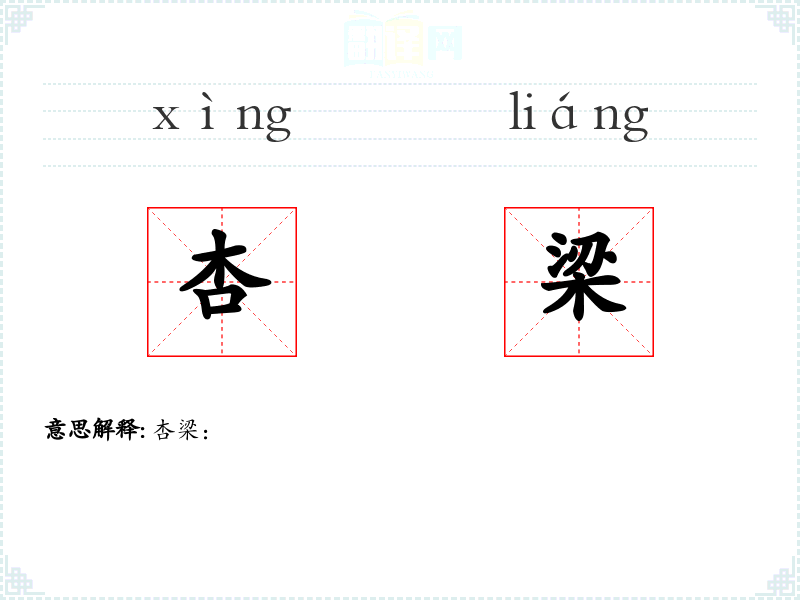 - 口语:在现代口语中,杏梁较少直接使用,但其象征意义可以通过其他词汇或表达方式体现,如“家中的梁柱”。