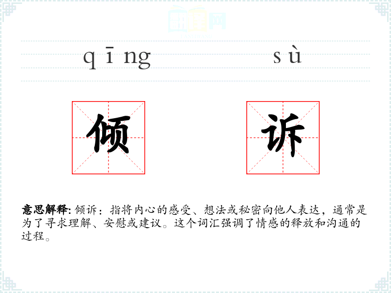 - 词源:“倾诉”由“倾”和“诉”两个字组成。“倾”原意为倾斜,引申为倾注、倾倒;“诉”原意为告诉、陈述。