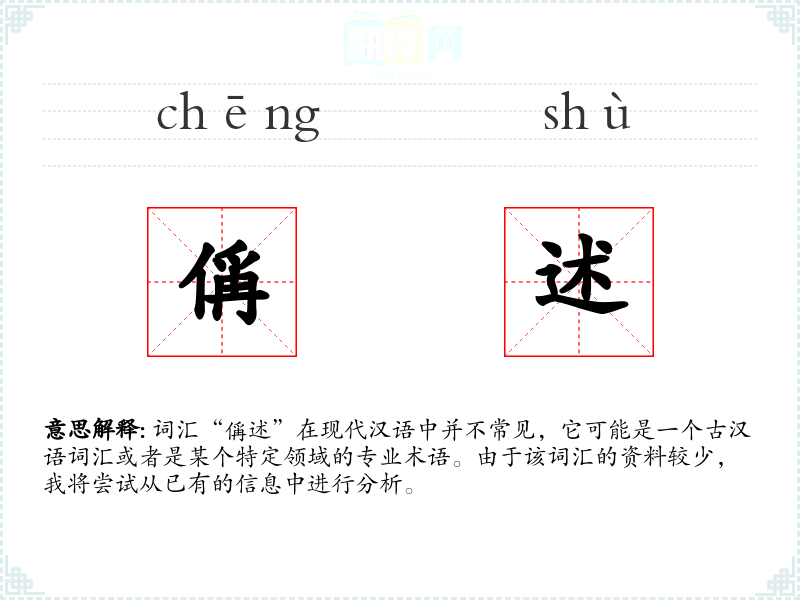 词汇“偁述”在现代汉语中并不常见,它可能是一个古汉语词汇或者是某个特定领域的专业术语。由于该词汇的资料较少,我将尝试从已有的信息中进行分析。