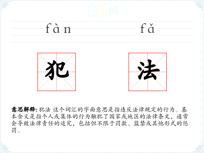 犯法 这个词汇的字面意思是指违反法律规定的行为。基本含义是指个人或集体的行为触犯了国家或地区的法律条文,通常会导致法律责任的追究,包括但不限于罚款、监禁或其他形式的惩罚。