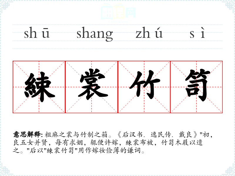 粗麻之裳与竹制之箱。《后汉书.逸民传.戴良》"初,良五女并贤,每有求姻,辄便许嫁,綀裳布被,竹笥木屐以遗之。"后以"綀裳竹笥"用作嫁妆俭薄的谦词。
