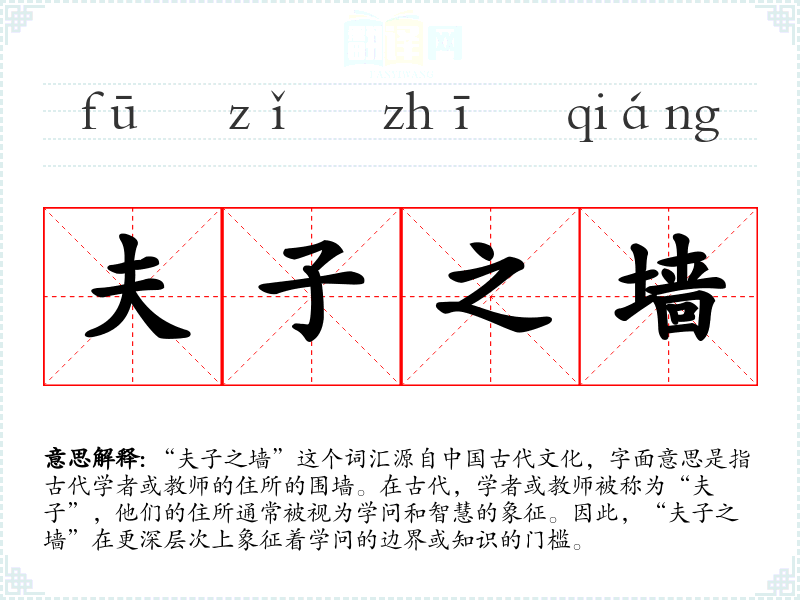 “夫子之墙”这个词汇源自**古代文化,字面意思是指古代学者或教师的住所的围墙。在古代,学者或教师被称为“夫子”,他们的住所通常被视为学问和智慧的象征。因此,“夫子之墙”在更深层次上象征着学问的边界或知识的门槛。