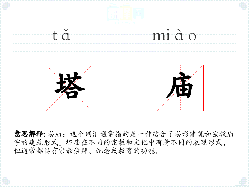 塔庙:这个词汇通常指的是一种结合了塔形建筑和庙宇的建筑形式。塔庙在不同的和文化中有着不同的表现形式,但通常都具有**崇拜、纪念或教育的功能。