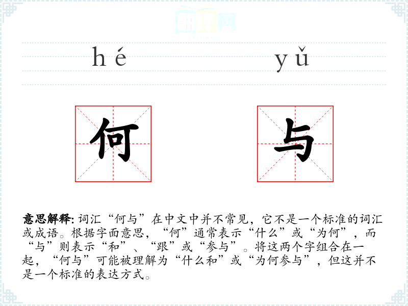 词汇“何与”在中文中并不常见,它不是一个标准的词汇或成语。根据字面意思,“何”通常表示“什么”或“为何”,而“与”则表示“和”、“跟”或“参与”。将这两个字组合在一起,“何与”可能被理解为“什么和”或“为何参与”,但这并不是一个标准的表达方式。