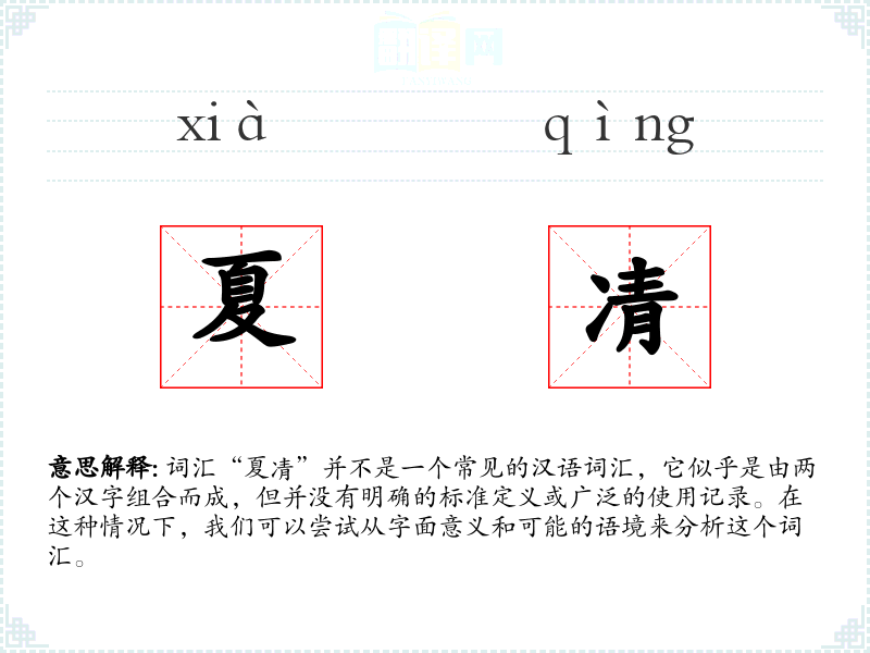词汇“夏凊”并不是一个常见的汉语词汇,它似乎是由两个汉字组合而成,但并没有明确的标准定义或广泛的使用记录。在这种情况下,我们可以尝试从字面意义和可能的语境来分析这个词汇。