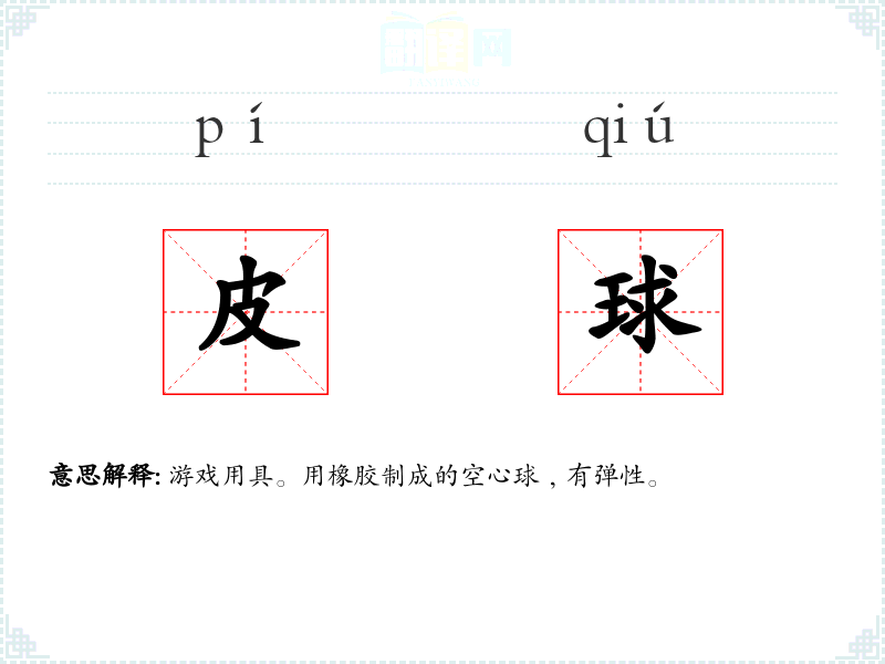 游戏用具。用橡胶制成的空心球﹐有弹性。
