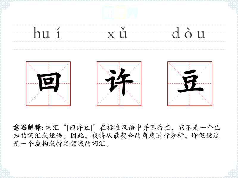 词汇“[回许豆]”在标准汉语中并不存在,它不是一个已知的词汇或短语。因此,我将从最契合的角度进行分析,即假设这是一个虚构或特定领域的词汇。