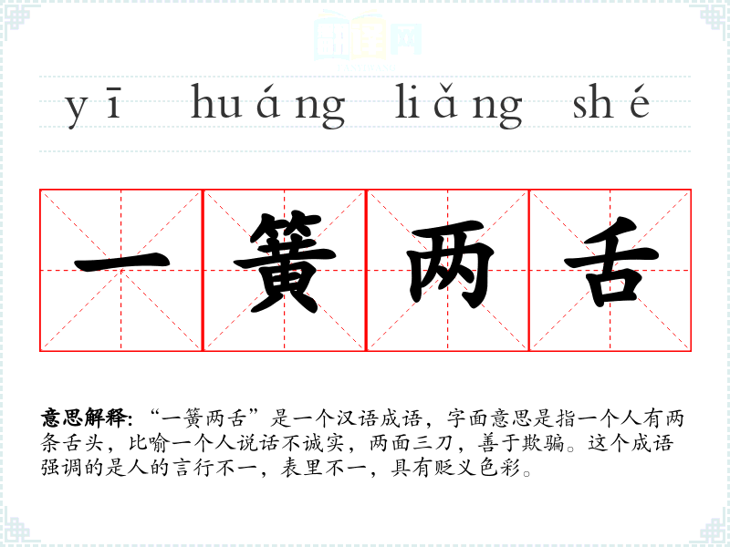 “一簧两舌”是一个汉语成语,字面意思是指一个人有两条舌头,比喻一个人说话不诚实,两面三刀,善于欺骗。这个成语强调的是人的言行不一,表里不一,具有贬义色彩。