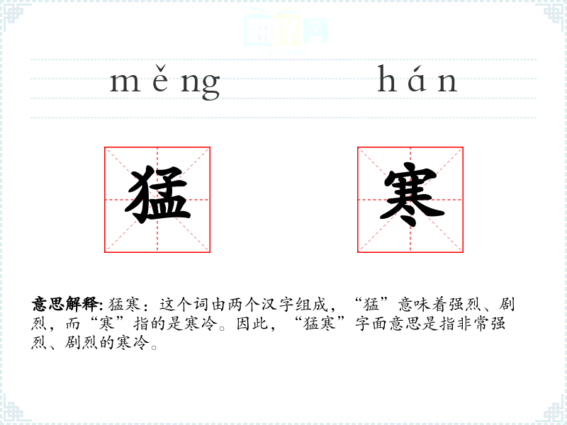 猛寒:这个词由两个汉字组成,“猛”意味着强烈、剧烈,而“寒”指的是寒冷。因此,“猛寒”字面意思是指非常强烈、剧烈的寒冷。