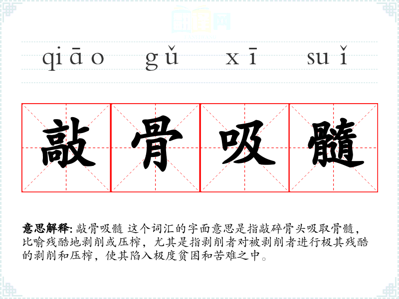 敲骨吸髓 这个词汇的字面意思是指敲碎骨头吸取骨髓,比喻残酷地剥削或压榨,尤其是指剥削者对被剥削者进行极其残酷的剥削和压榨,使其陷入极度贫困和苦难之中。