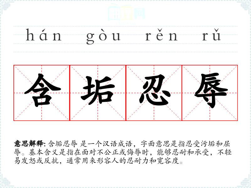 含垢忍辱 是一个汉语成语,字面意思是指忍受污垢和屈辱。基本含义是指在面对不公正或侮辱时,能够忍耐和承受,不轻易发怒或反抗,通常用来形容人的忍耐力和宽容度。
