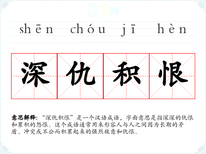 在传统文化中,“深仇积恨”常常与家族荣誉、忠诚和复仇等主题相关联。在社会背景中,这个词汇可能与历史、家族纠纷或个人经历中的重大冲突有关。