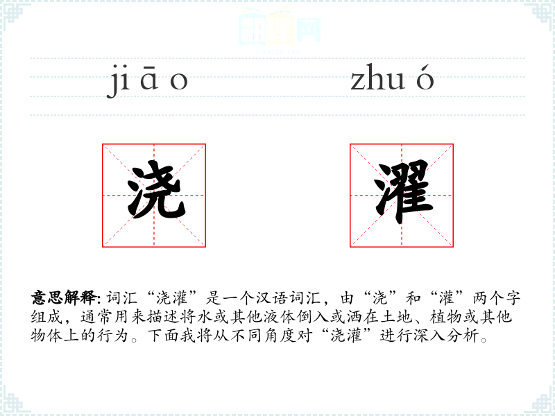词汇“浇灌”是一个汉语词汇,由“浇”和“灌”两个字组成,通常用来描述将水或其他液体倒入或洒在土地、植物或其他物体上的行为。下面我将从不同角度对“浇灌”进行深入分析。