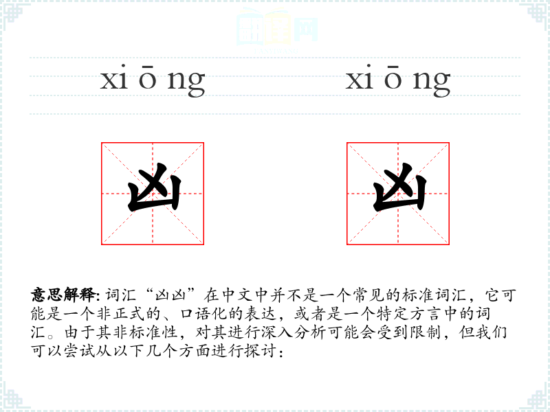 由于“凶凶”不是一个标准词汇,它在不同语境下的使用可能非常有限。在口语中,它可能被用来形容某人看起来很凶狠或威胁,但在正式文学或专业领域中,这个词可能不会出现。