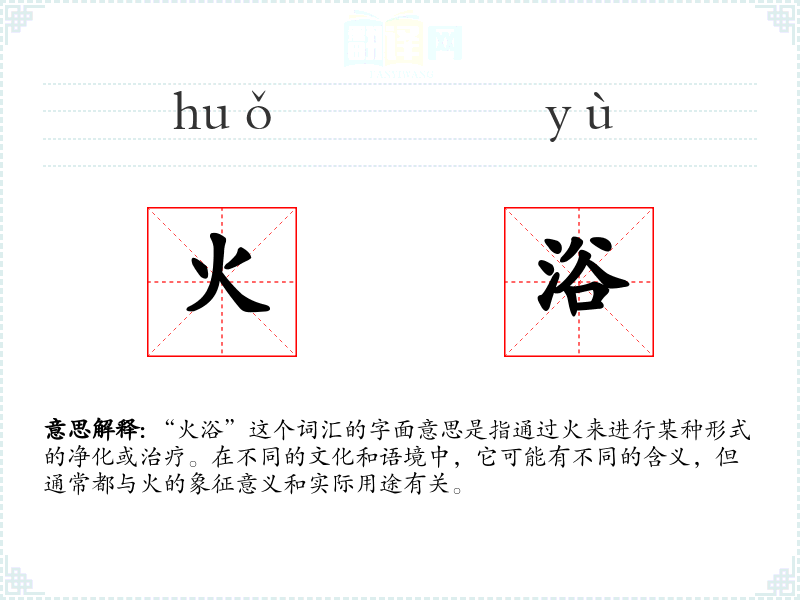 “火浴”这个词汇的字面意思是指通过火来进行某种形式的净化或治疗。在不同的文化和语境中,它可能有不同的含义,但通常都与火的象征意义和实际用途有关。