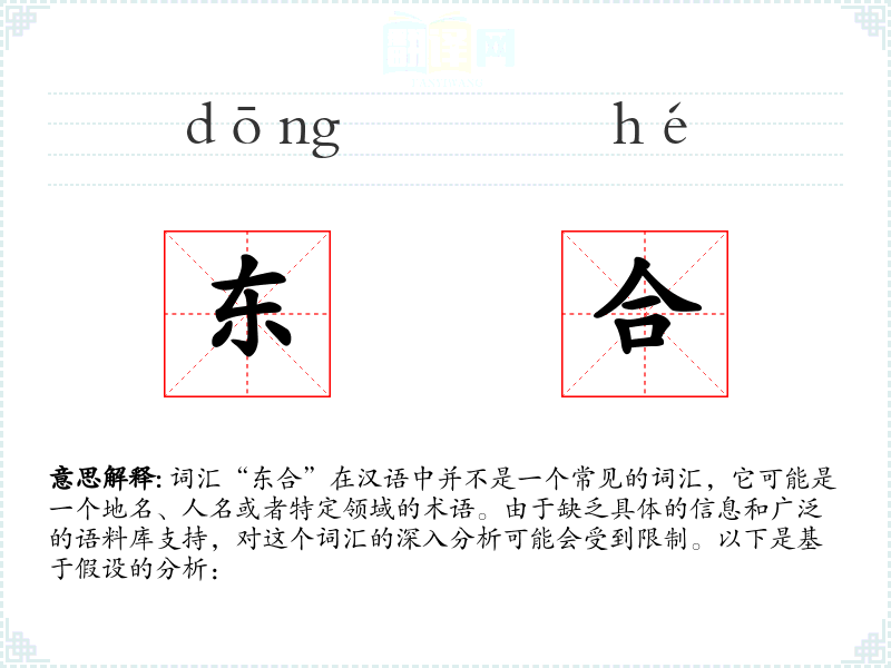 - 由于“东合”不是一个常见的词汇,它在不同语言或文化中的对应词汇可能不存在。