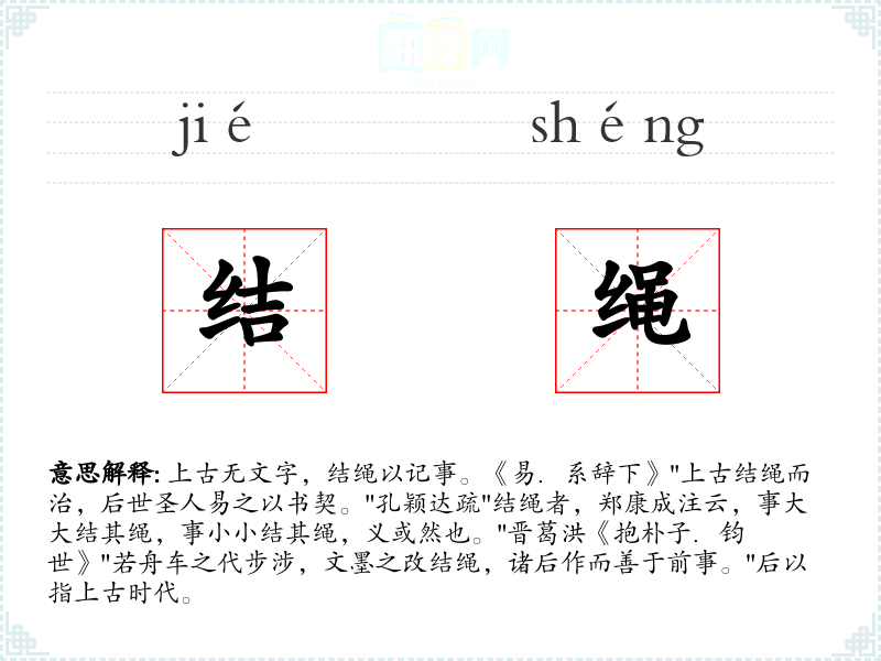 1.上古无文字,结绳以记事。《易.系辞下》"上古结绳而治,后世圣人易之以书契。"孔颖达疏"结绳者,郑康成注云,事大大结其绳,事小小结其绳,义或然也。"晋葛洪《抱朴子.钧世》"若舟车之代步涉,文墨之改结绳,诸后作而善于前事。"后以指上古时代。