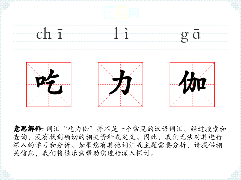 词汇“吃力伽”并不是一个常见的汉语词汇,经过搜索和查询,没有找到确切的相关资料或定义。因此,我们无法对其进行深入的学习和分析。如果您有其他词汇或主题需要分析,请提供相关信息,我们将很乐意帮助您进行深入探讨。
