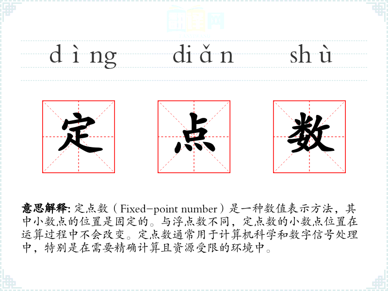 在不同语言中,定点数的概念通常是相似的。例如,在英语中,定点数被称为 "fixed-point number",在德语中被称为 "Festkommazahl"。这些词汇都强调了小数点的固定位置。
