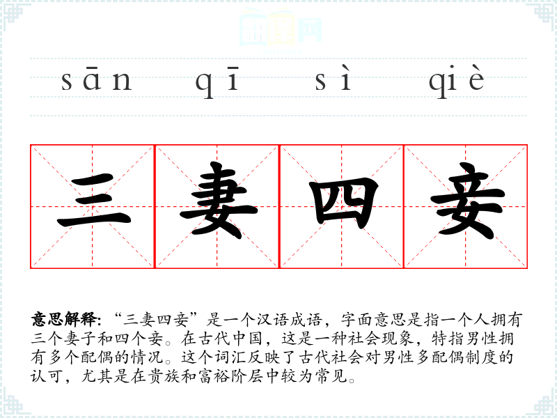 “三妻四妾”是一个汉语成语,字面意思是指一个人拥有三个妻子和四个妾。在古代**,这是一种社会现象,特指男性拥有多个配偶的情况。这个词汇反映了古代社会对男性多配偶制度的认可,尤其是在贵族和富裕阶层中较为常见。