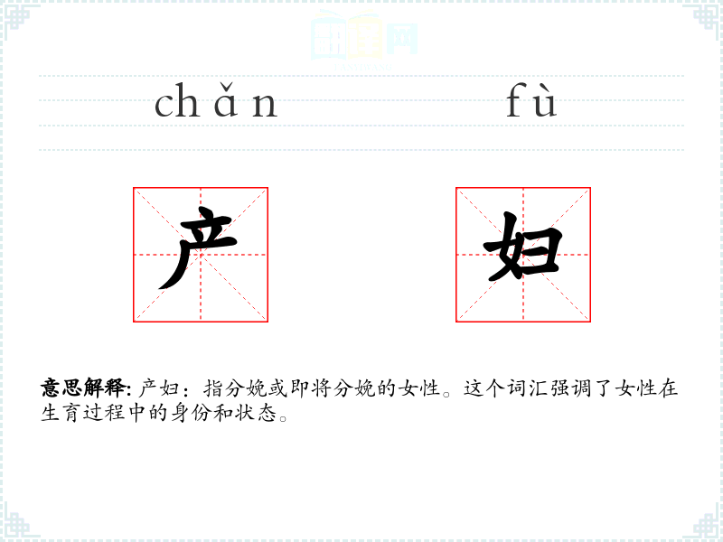 产妇:指分娩或即将分娩的女性。这个词汇强调了女性在生育过程中的身份和状态。