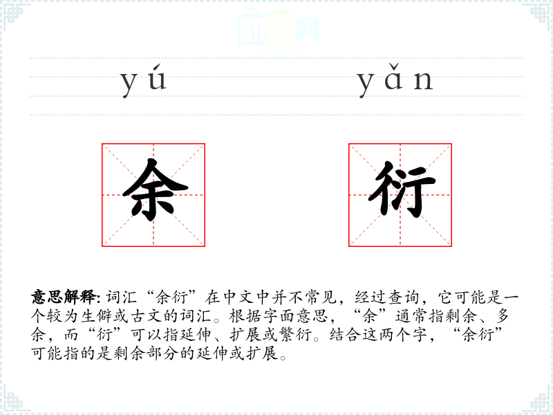 词汇“余衍”在中文中并不常见,经过查询,它可能是一个较为生僻或古文的词汇。根据字面意思,“余”通常指剩余、多余,而“衍”可以指延伸、扩展或繁衍。结合这两个字,“余衍”可能指的是剩余部分的延伸或扩展。