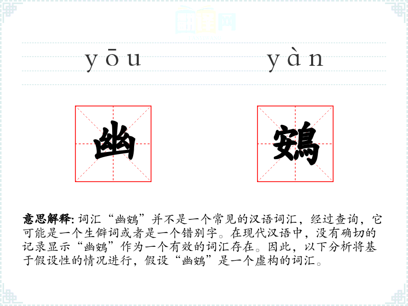 由于“幽鴳”不是一个已知的词汇,我们无法提供确切的基本定义。如果假设它是一个词汇,我们可以推测它可能由“幽”和“鴳”两个字组成。其中,“幽”通常指幽暗、隐秘或深邃,而“鴳”则不是一个标准的汉字,可能需要进一步的解释或假设。