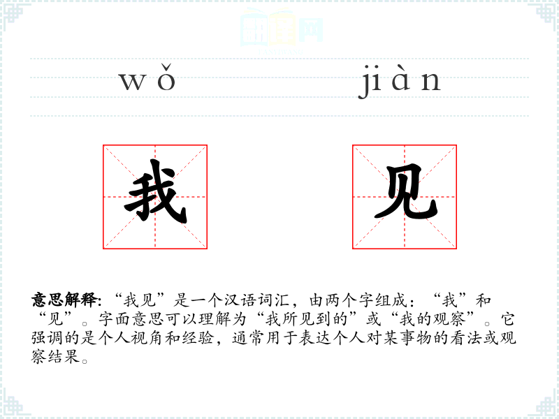 “我见”是一个汉语词汇,由两个字组成:“我”和“见”。字面意思可以理解为“我所见到的”或“我的观察”。它强调的是个人视角和经验,通常用于表达个人对某事物的看法或观察结果。