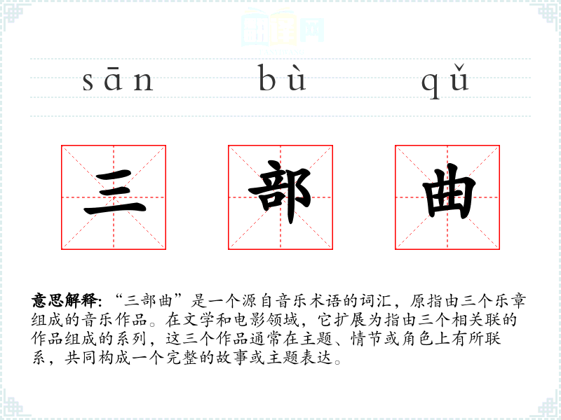 “三部曲”是一个源自音乐术语的词汇,原指由三个乐章组成的音乐作品。在文学和电影领域,它扩展为指由三个相关联的作品组成的系列,这三个作品通常在主题、情节或角色上有所联系,共同构成一个完整的故事或主题表达。