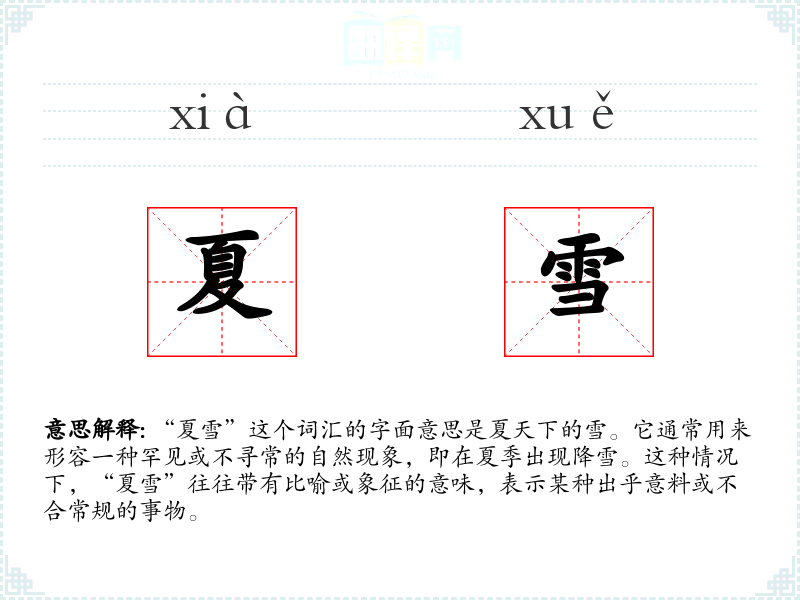 “夏雪”这个词汇的词源直接来源于汉语,由“夏”和“雪”两个字组成。在古代文学中,夏雪常被用来形容极端或异常的天气现象,随着时间的推移,它逐渐被赋予了更多的象征意义。