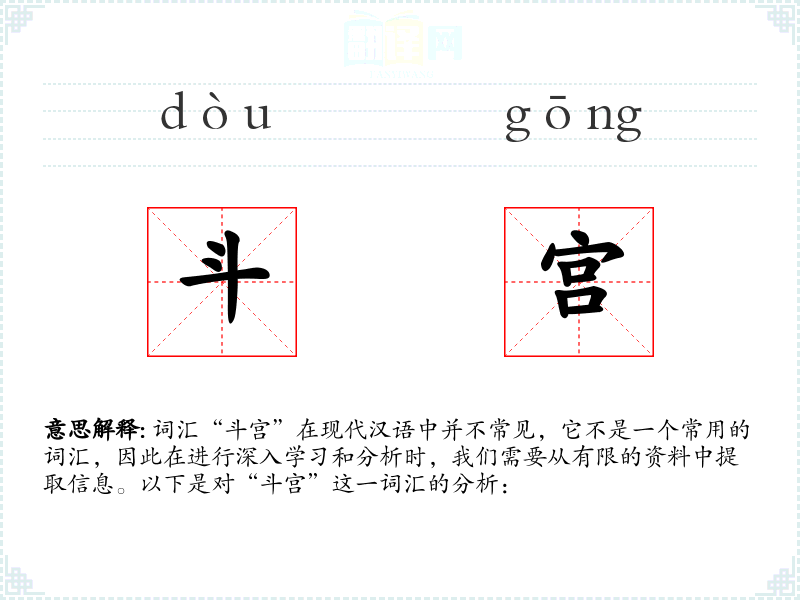 词汇“斗宫”在现代汉语中并不常见,它不是一个常用的词汇,因此在进行深入学*和分析时,我们需要从有限的资料中提取信息。以下是对“斗宫”这一词汇的分析: