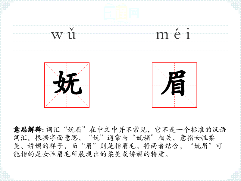 在东亚文化中,眉毛的形状和修饰一直被认为是女性美的重要组成部分。因此,“妩眉”可能在这样的文化背景下被赋予更多的美学和情感价值。