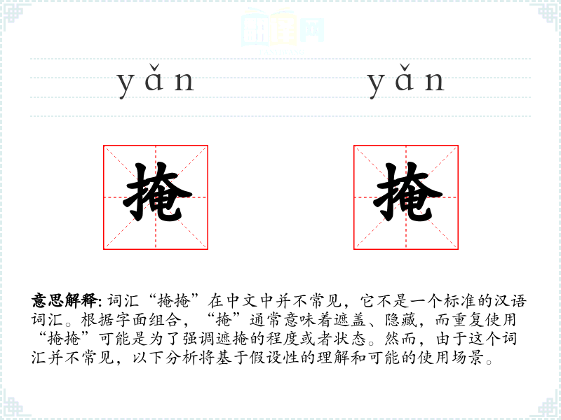 “掩掩”可能被理解为一种强调遮掩、隐藏的状态或行为,暗示着某种程度的隐秘或不透明。
