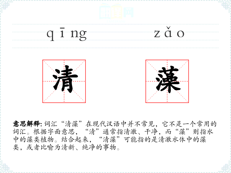 词汇“清藻”在现代汉语中并不常见,它不是一个常用的词汇。根据字面意思,“清”通常指清澈、干净,而“藻”则指水中的藻类植物。结合起来,“清藻”可能指的是清澈水体中的藻类,或者比喻为清新、纯净的事物。
