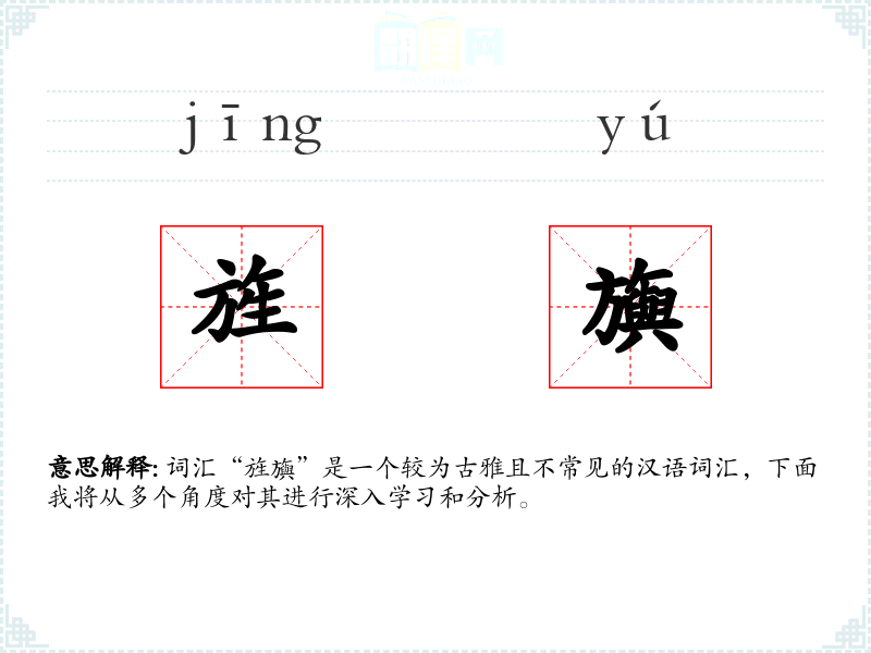 词汇“旌旟”是一个较为古雅且不常见的汉语词汇,下面我将从多个角度对其进行深入学*和分析。