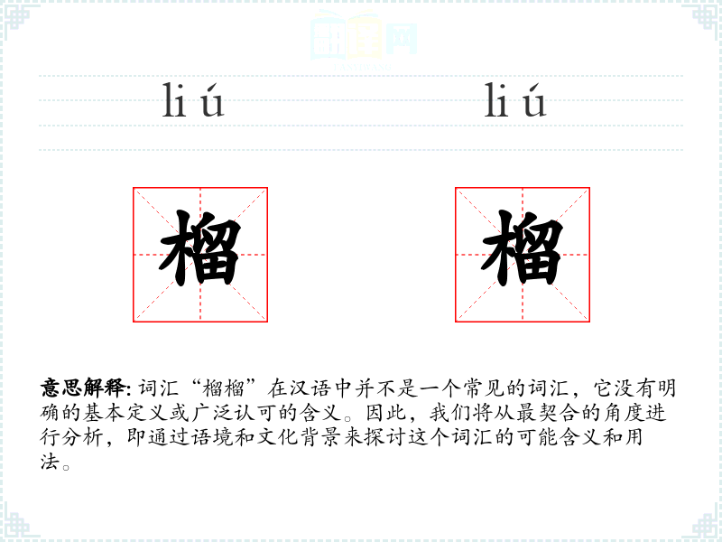 由于“榴榴”不是一个标准词汇,我们无法提供一个确切的字面意思和基本含义。它可能是某个方言中的词汇,或者是某个特定社群中的俚语。