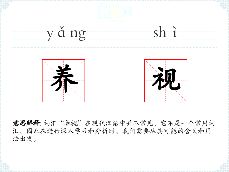 词汇“养视”在现代汉语中并不常见,它不是一个常用词汇,因此在进行深入学习和分析时,我们需要从其可能的含义和用法出发。