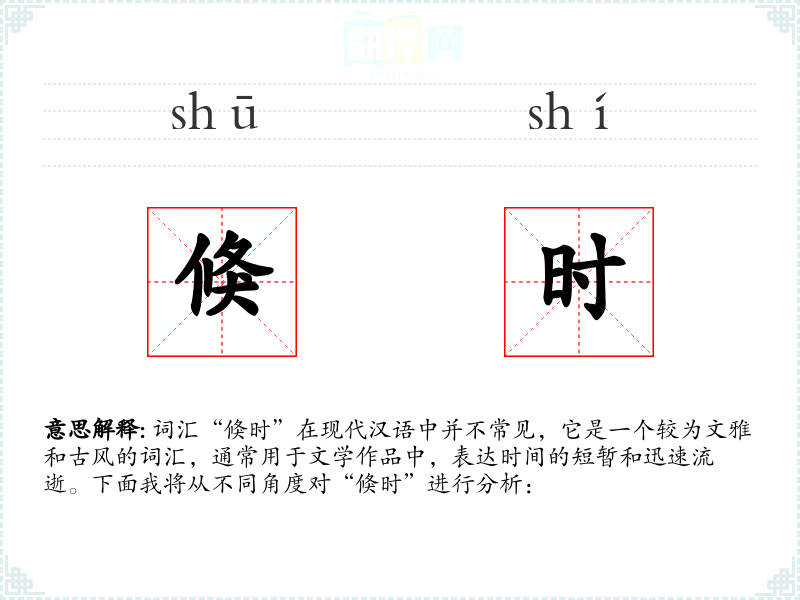 - 文学语境:在古典文学中,如诗词、散文,常用“倏时”来描绘时间的流逝,如“倏时已逝,往事如烟”。