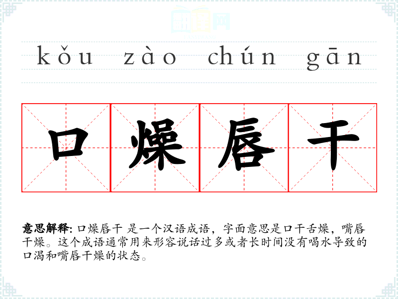 口燥唇干 是一个汉语成语,字面意思是口干舌燥,嘴唇干燥。这个成语通常用来形容说话过多或者长时间没有喝水导致的口渴和嘴唇干燥的状态。