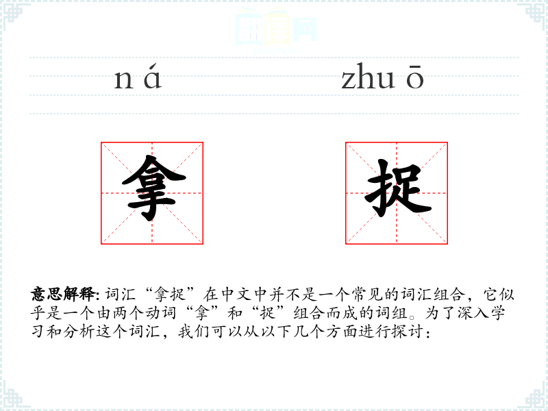 词汇“拿捉”在中文中并不是一个常见的词汇组合,它似乎是一个由两个动词“拿”和“捉”组合而成的词组。为了深入学*和分析这个词汇,我们可以从以下几个方面进行探讨: