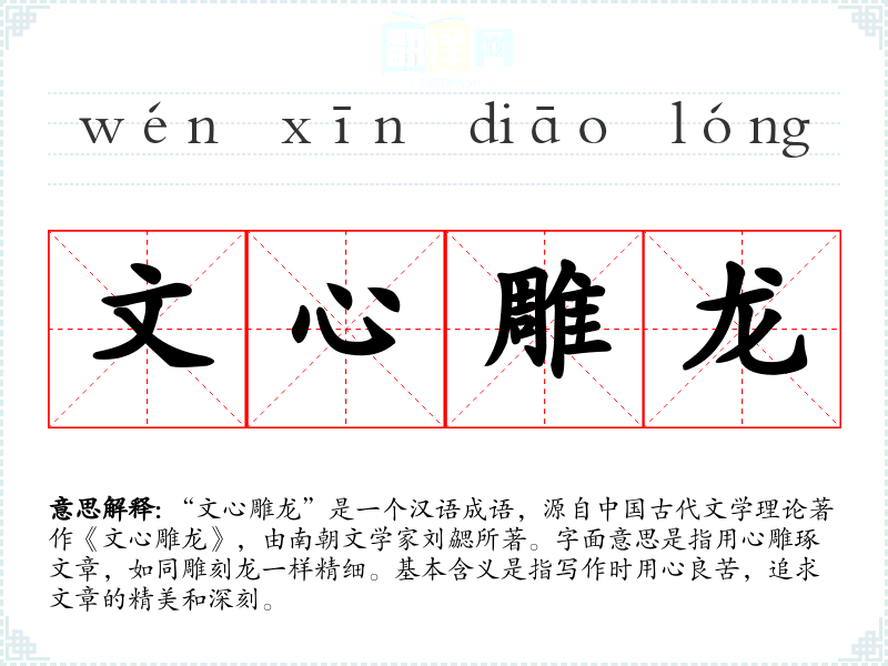 “文心雕龙”是一个汉语成语,源自**古代文学理论著作《文心雕龙》,由南朝文学家刘勰所著。字面意思是指用心雕琢文章,如同雕刻龙一样精细。基本含义是指写作时用心良苦,追求文章的精美和深刻。