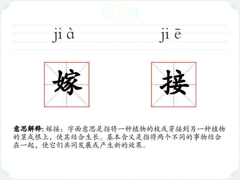 嫁接:字面意思是指将一种植物的枝或芽接到另一种植物的茎或根上,使其结合生长。基本含义是指将两个不同的事物结合在一起,使它们共同发展或产生新的效果。