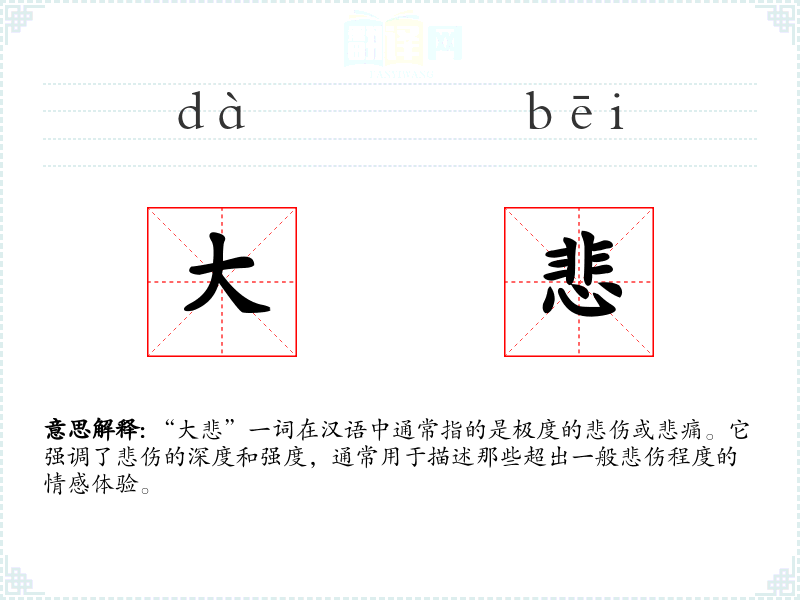 “大悲”一词在汉语中通常指的是极度的悲伤或悲痛。它强调了悲伤的深度和强度,通常用于描述那些超出一般悲伤程度的情感体验。