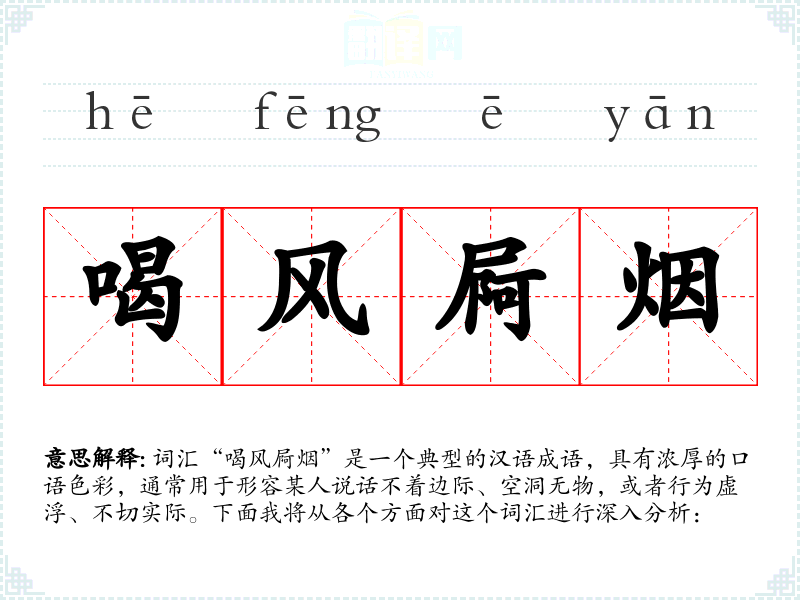 词汇“喝风屙烟”是一个典型的汉语成语,具有浓厚的口语色彩,通常用于形容某人说话不着边际、空洞无物,或者行为虚浮、不切实际。下面我将从各个方面对这个词汇进行深入分析: